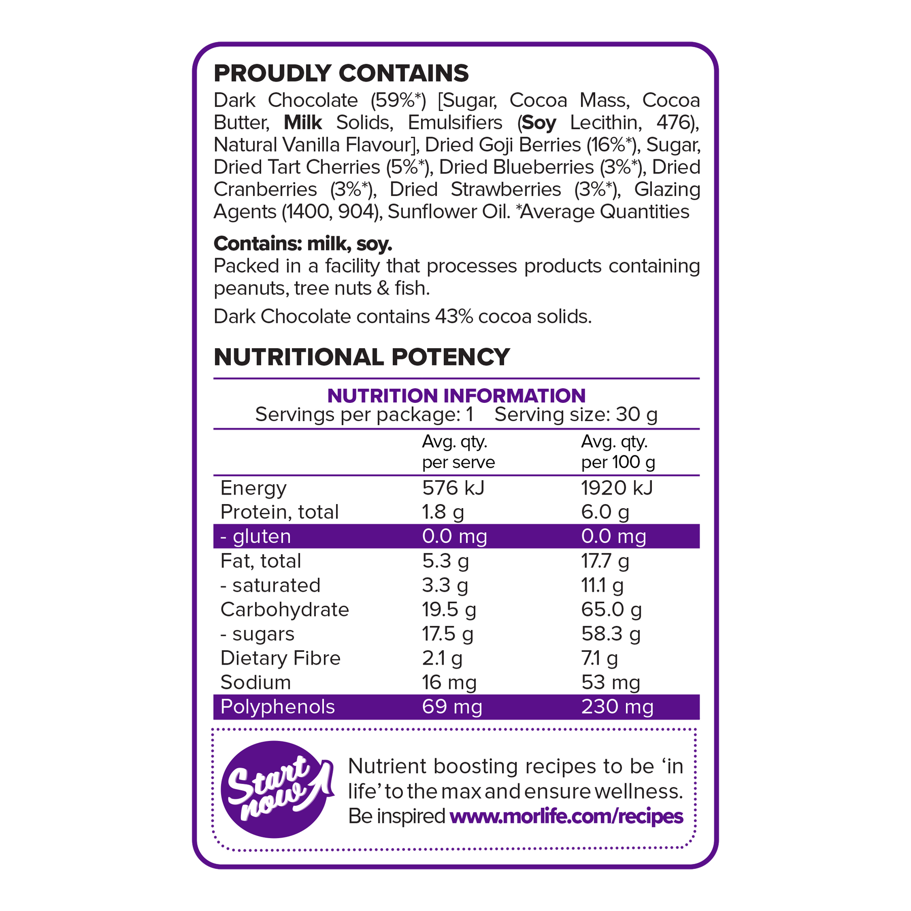 Experience our dark chocolate super snacks. Morlife has created the ultimate indulgence, with delectable dried berries coated in premium dark chocolate, creating a deliciously decadent treat. Dark Chocolate 5 Berry Mix features; Goji Berries, Sour Cherries, Blueberries, Cranberries and Strawberries.