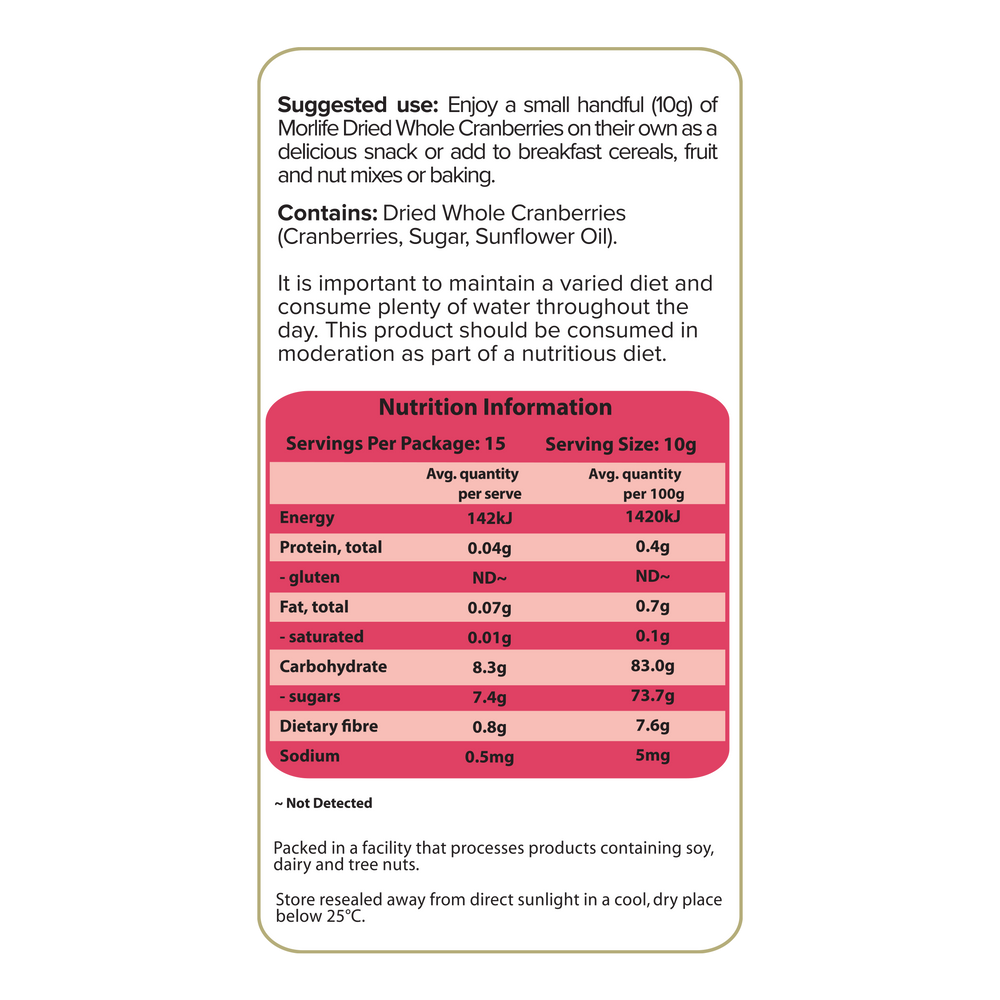Enjoy a small handful (10g) of Morlife Dried Cranberries on their own as a delicious snack, or create a super-fruit boost with your favourite recipe. Great to mix into smoothies, frappes, in breakfast cereals, muffins, slices, fruit & nut mixes, yoghurt, salads, couscous or any other recipe.
