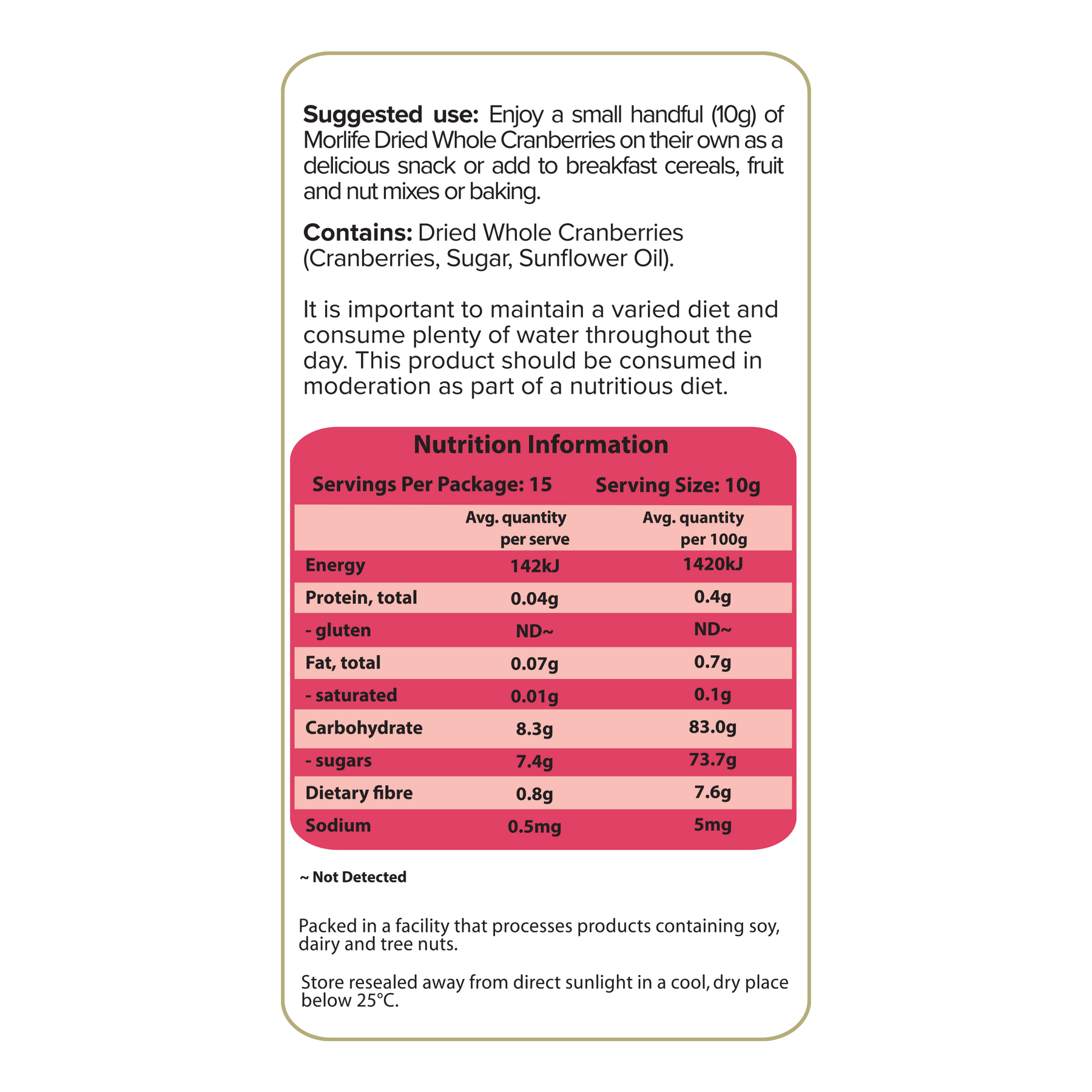 Morlife has carefully selected cranberries that are dried using an infusion process that creates a moist and delicious soft textured cranberry bursting with sweetness and flavour.
