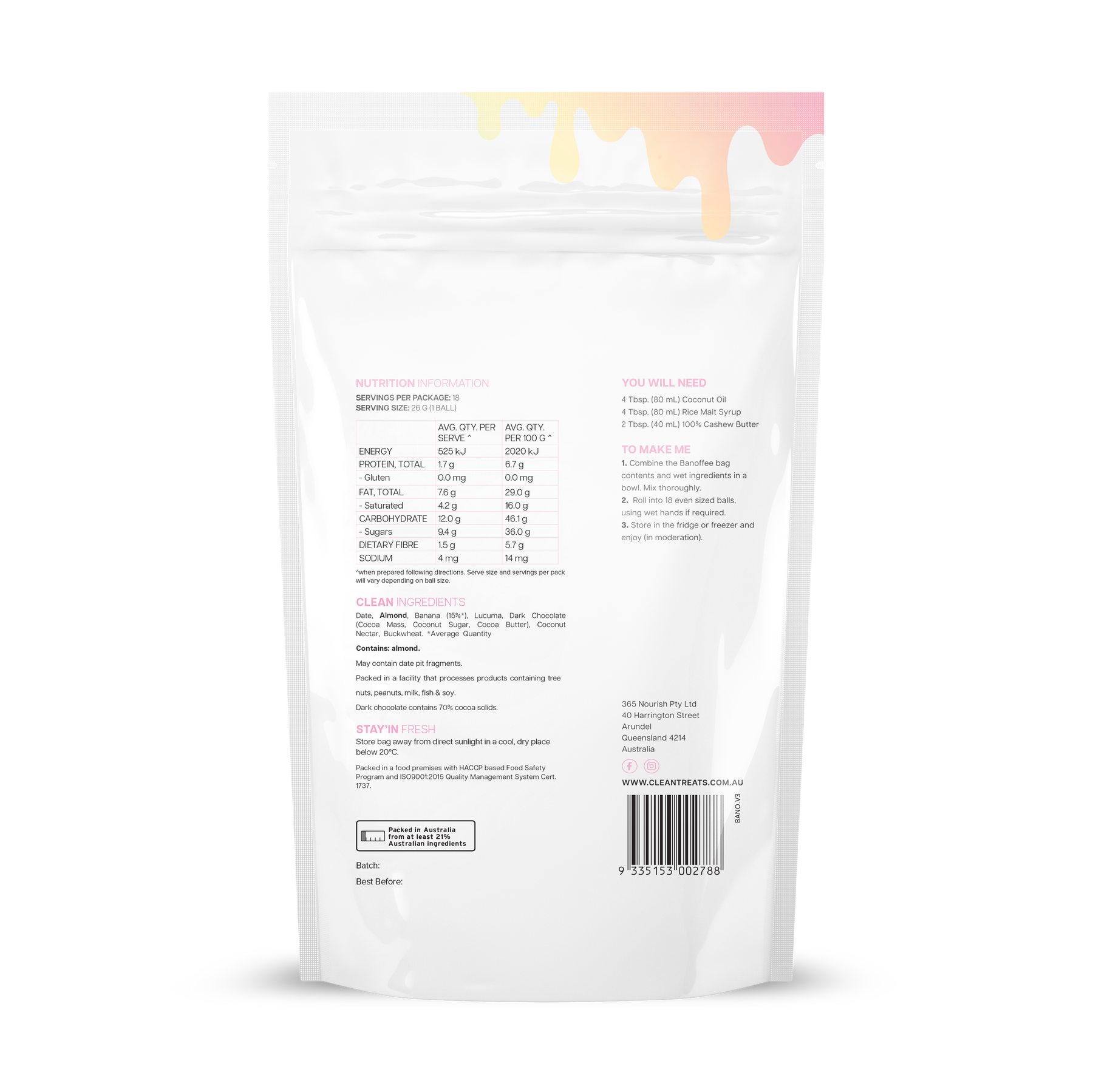 Date, Almond, Banana (15%*), Lucuma, Dark Chocolate (Cocoa Mass, Coconut Sugar, Cocoa Butter), Coconut Nectar, Buckwheat. *Average Quantity