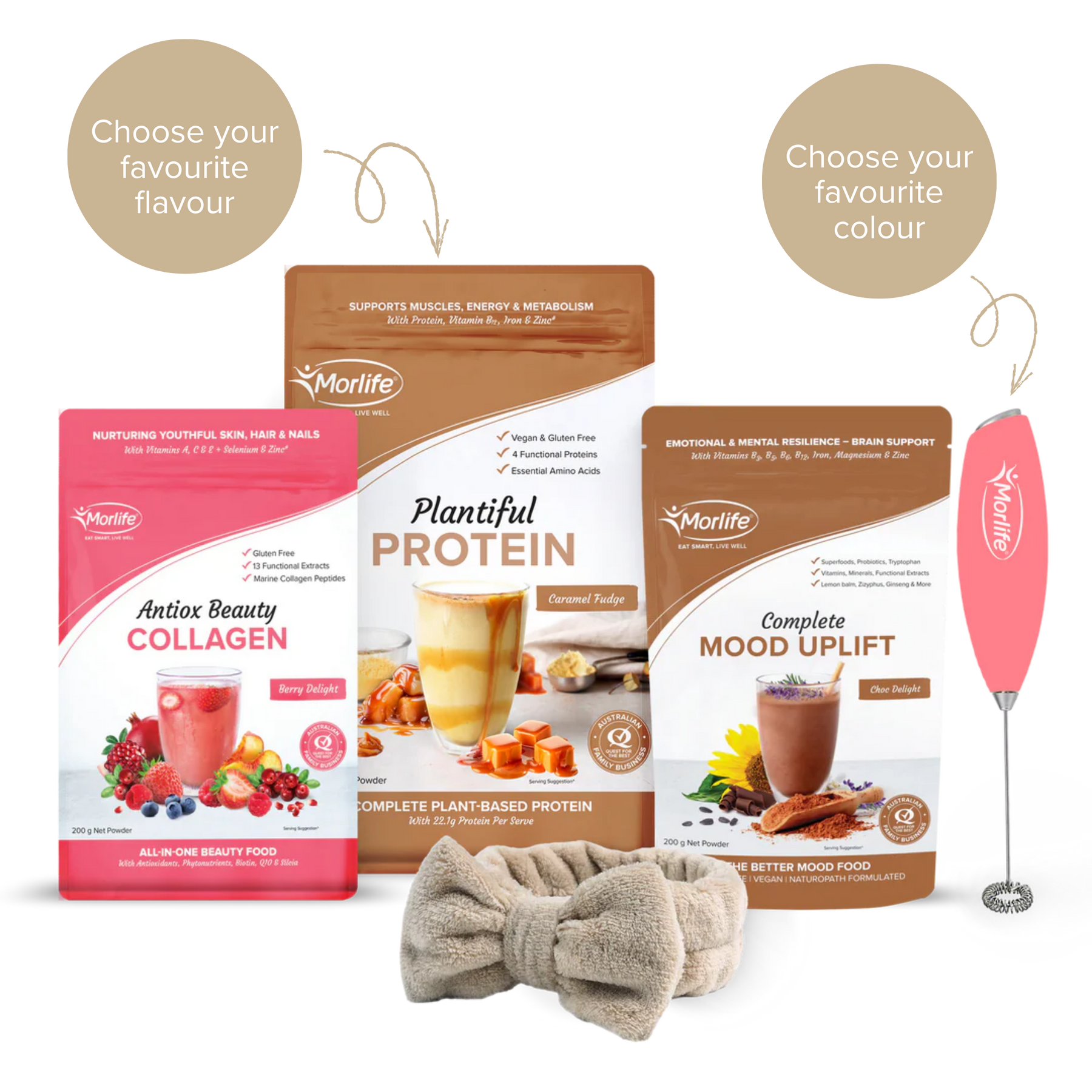 For the mum who never stops, this bundle has her back. Packed with daily essentials to nourish, uplift, and energise, it’s her all-in-one wellness reset. Featuring Plantiful Protein (440g), Complete Mood Uplift (200g), Antiox Beauty Collagen (200g), a Hand Mixer, and a bonus Hair Band - this limited-time bundle helps her feel her best, fast. *Please be sure to choose your favourite Plantiful Protein flavour and Whisk colour from the dropdown menu below.
