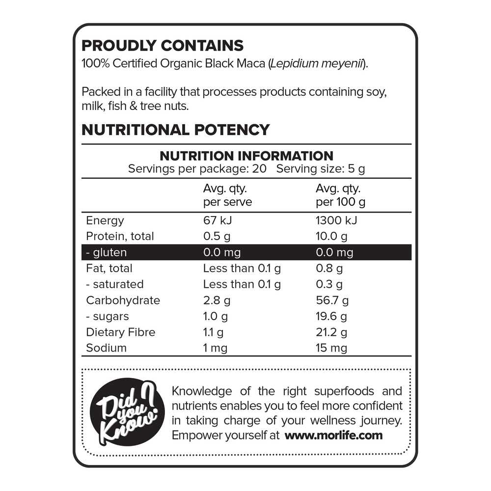 Mix ½ tbsp. (5g) of Morlife Certified Organic Black Maca with water, juices, smoothies, yoghurt, cereals or any other foods to get ‘more’ out of life®!