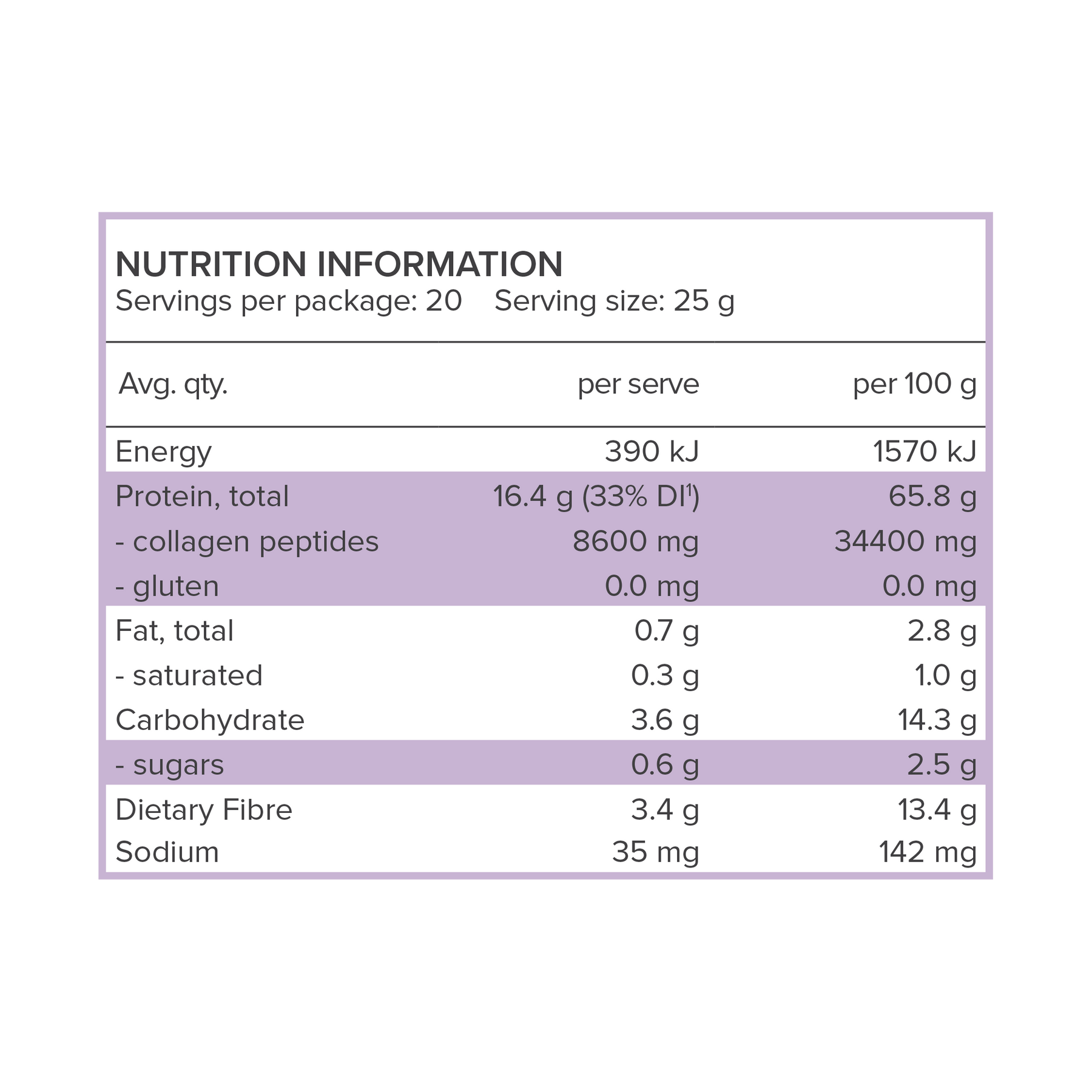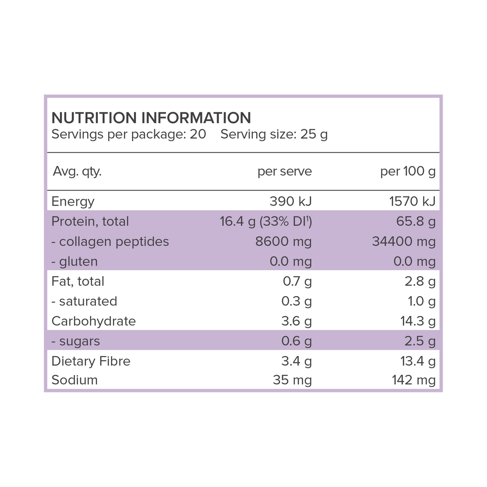 Verisol® Hydrolysed Collagen Peptides (34%*), Organic Brown Rice Protein~, Organic Pea Protein~, Prebiotic Fibres (Organic Fructooligosaccharides~, Acacia Gum, Apple Pectin), Natural Flavours, Organic Peruvian Lucuma~, Thickener (Guar Gum), Bourbon Vanilla Bean (1%*), Digestive Enzymes (0.4%*) (Papain).  *Average Quantities ~Certified Organic by ACO Certification Ltd.