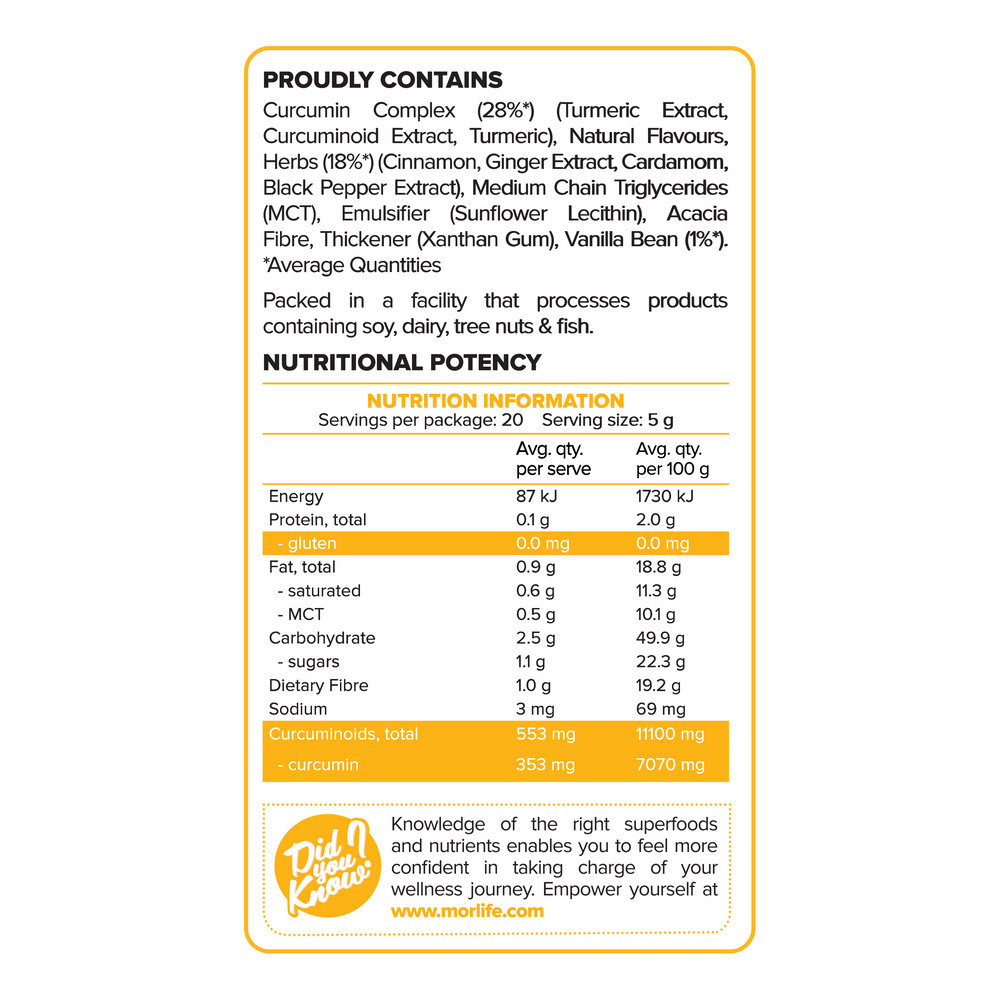 Say yellow to wellness with our Spiced Vanilla Turmeric Latte. This hug in a mug contains high curcumin extracts from turmeric and is bioactivated with MCT Oil and Black Pepper Extract. Coupled with sweet ‘n’ spicy Vanilla, Cinnamon, Ginger and Cardamom, warm your insides with this caffeine-free golden elixir that’ll make you sparkle from the inside out.
