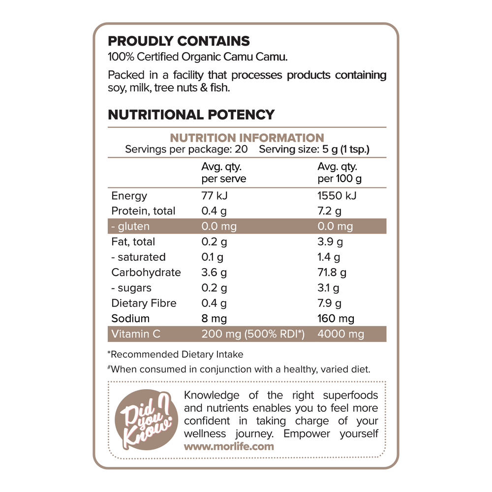 Good things come in small packages, and that is especially true when it comes to the Camu Camu fruit. Native to the Amazon, this small yet mighty fruit provides a great source of natural vitamin C for optimal immune function and energy production#. With a citrus-berry flavour, Morlife Certified Organic Camu Camu Powder will add a unique and nutritious twist to juices, smoothies or baking mixes.