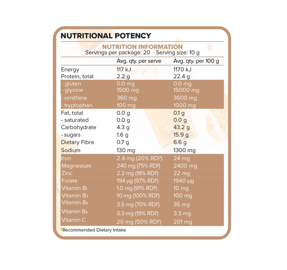 Fruits (Lucuma, Date (7%*), Banana (3%*), Tart Cherry), Amino Acids (L-Glycine, L-Ornithine, L-Tryptophan), Minerals (Magnesium Citrate, Zinc Gluconate, Ferrous Fumarate (Iron)), Functional Extracts (15%*) (Passionflower (8%*), Green Tea, Magnolia, Acerola Cherry, Lavender (0.5%*), Chamomile, Lemon Balm, Turmeric, Hops, Valerian), Caramel Natural Flavour, Creamy Vanilla Natural Flavour, Himalayan Salt, Stabiliser (Xanthan Gum), Sweetener (Monk Fruit Extract), Vitamins (B3, B5, B1, B6, Folic Acid). *Average Quantities
