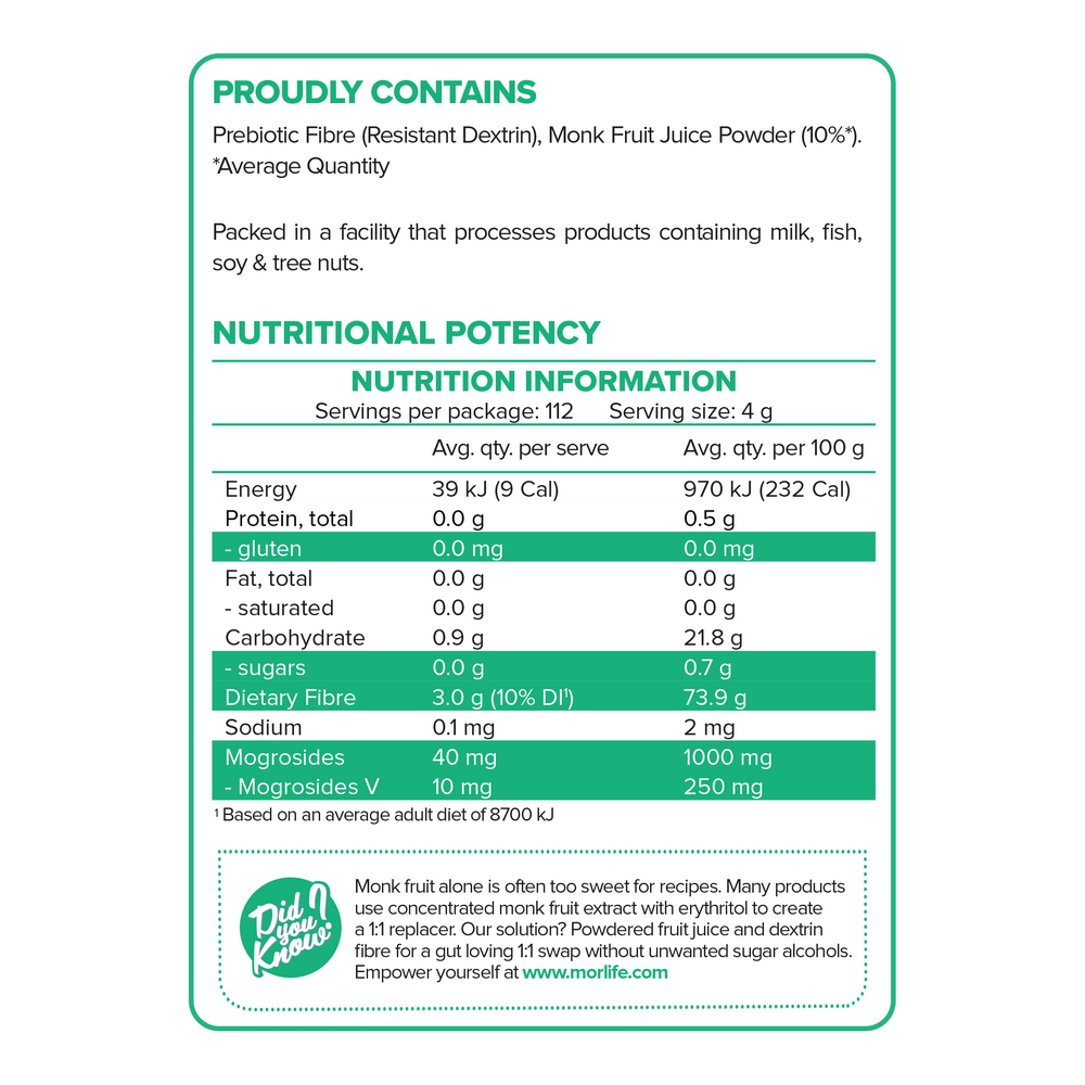 Morlife Monk Fruit + Fibre can be used as a 1-for-1 substitute for sugar in anything that needs sweetening, including, hot and cold beverages, smoothies, cooking, and baking. For example, 1 sp. (approx. 4g) of Morlife Monk Fruit + Fibre provides sweetness comparable to 1sp. (approx. 4g of sugar).